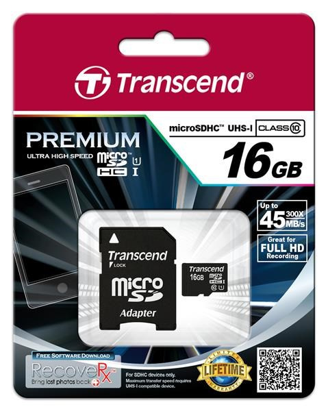 Karta TRANSCEND MicroSDHC 16GB Premium, Class 10 UHS-I 300x + adaptér