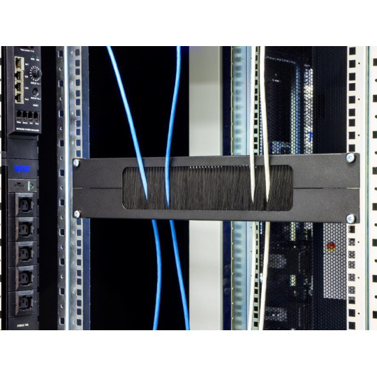 19" 2U priechodný panel, horizontálne delený, kefka, otvor 330 x 55 mm.
