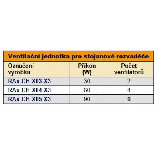 Ventilačná jednotka pre stojanové rozvádzače - inštaluje sa do uzáveru z vonkajšej strany rozvádzača, do základne z vnútornej strany rozvádzača. Pri inštalácii do základne skrine sa musí použiť montážny rám spodnej ventilačnej jednotky - RAx-CH-Xxx-X1, ktorý sa inštaluje pomocou obojstrannej lepiacej pásky.
