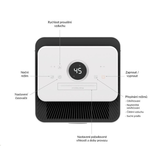 Odvlhčovač je vybavený časovačom, ktorý nastavíte na dotykovom displeji. Určite vás poteší aj nočný režim, kedy odvlhčovač pracuje automaticky a ticho, takže vás nijak neruší pri spánku. Výhodou je aj špeciálny režim na sušenie bielizne, ktorý inak výrazne zvyšuje vlhkosť vzduchu. S týmto režimom vás nadbytočná vlhkosť trápiť nebude a bielizeň vám bude rýchlejšie schnúť.