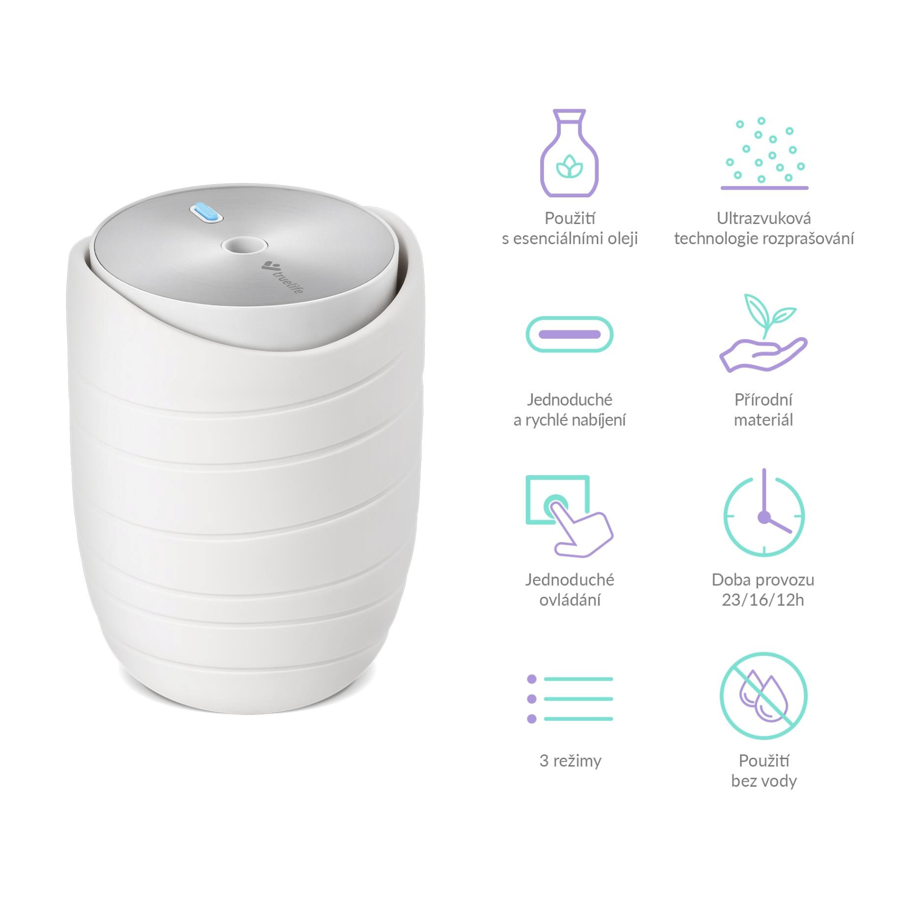 Užívajte si dlhé hodiny príjemnej vône, ktorá prenikne do každého kúska vášho bytu, kancelárie či štúdia. Vďaka kompaktnému designu umiestnite difuzér TrueLife AIR Diffuser WL5 naozaj kamkoľvek. Batéria vydrží v prevádzke 23, 16 alebo 12 hodín v závislosti na výbere jedného z 3 režimov intenzity uvoľňovania vône. Difúzer sa zaobíde úplne bez vody, na špeciálny nadstavec iba naskrutkujete fľaštičku s esenciálnym olejom, ktorý je rovnomerne uvoľňovaný vďaka technológii OilFlow®. Vôňa do vzduchu preniká pomocou ultrazvukovej technológie, ktorá pracuje veľmi ticho. Difúzer sa stane aj ozdobou každého interiéru vďaka svojmu dizajnu a prírodnému telu z keramiky. Akonáhle poklesne kapacita batérie, difuzér vás upozorní a vypne sa. Potom ho iba stačí pripojiť cez USB-C a dobiť.