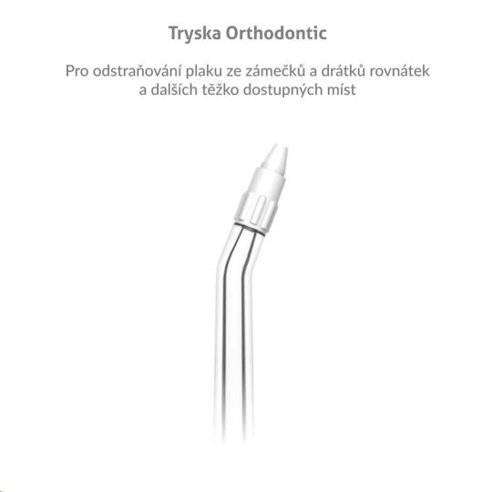 Ortodontická tryska na odstraňovanie plaku zo zámkov a drôtikov rovnátok a ďalších ťažko dostupných miest.