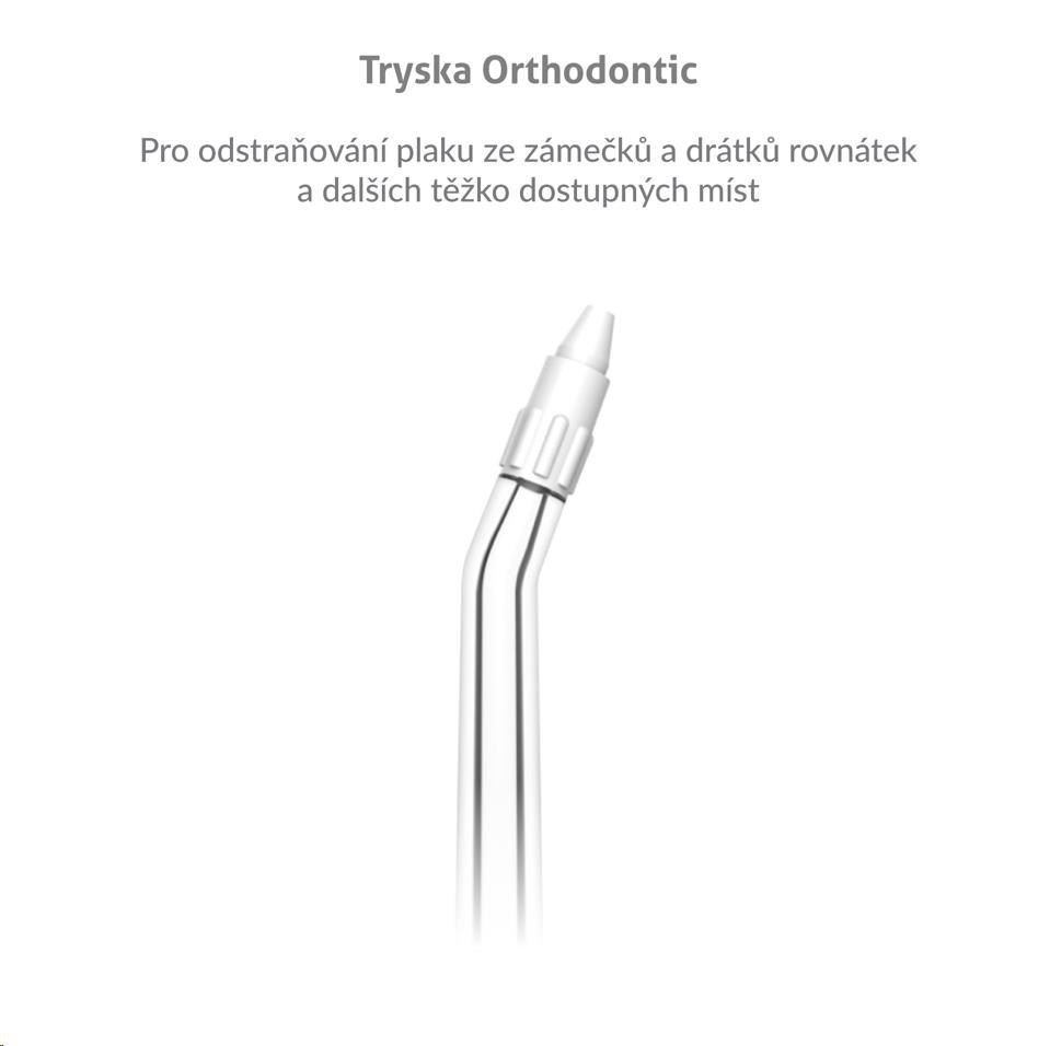 Ortodontická tryska na odstraňovanie plaku zo zámkov a drôtikov rovnátok a ďalších ťažko dostupných miest.