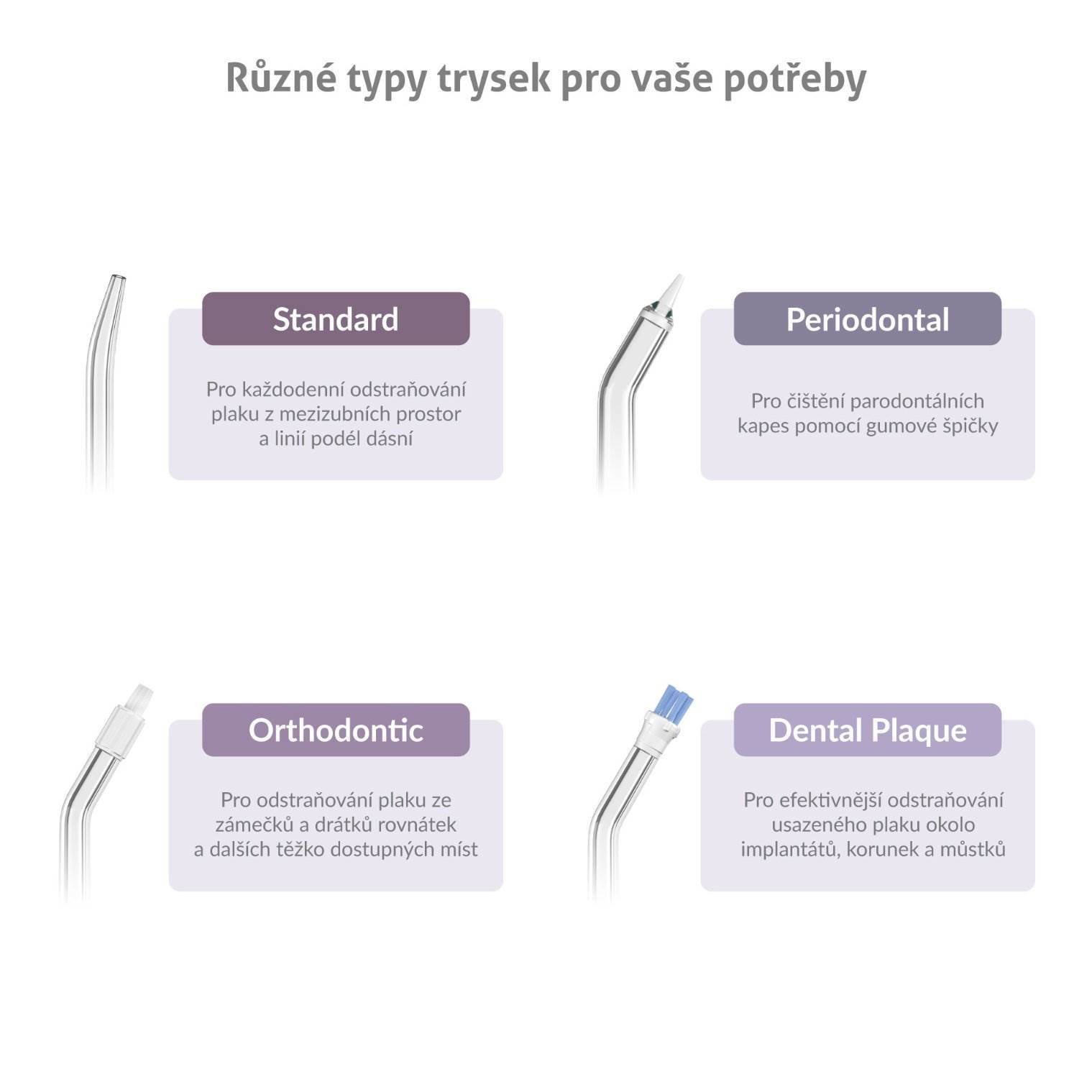 U AquaFloss Station S600 máte na výber z desiatich úrovní tlaku vody, v rozmedzí 30–125 PSI, čistenie zubov si tak môžete plne prispôsobiť. Požadovaný tlak si nastavíte pomocou kolieska na stanici. Súčasťou sprchy je 6 špeciálnych trysiek (3× Standard, 1× Orthodontic, 1× Periodontal, 1× Dental Plaque), navrhnuté pre rôzne potreby: