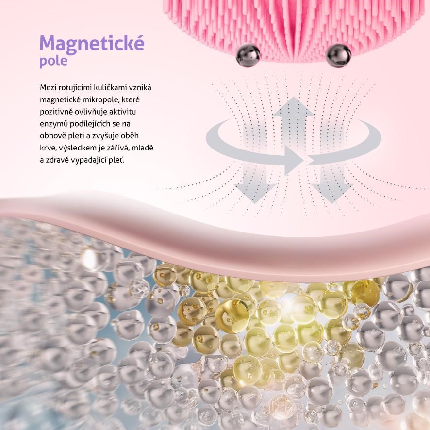 Magnetické mikropole vznikajúce medzi rotujúcimi masážnymi guličkami podporuje vstrebávanie pleťových prípravkov a tiež revitalizáciu a napnutie pleti vďaka aktivácii enzýmov podieľajúcich sa na jej obnove.