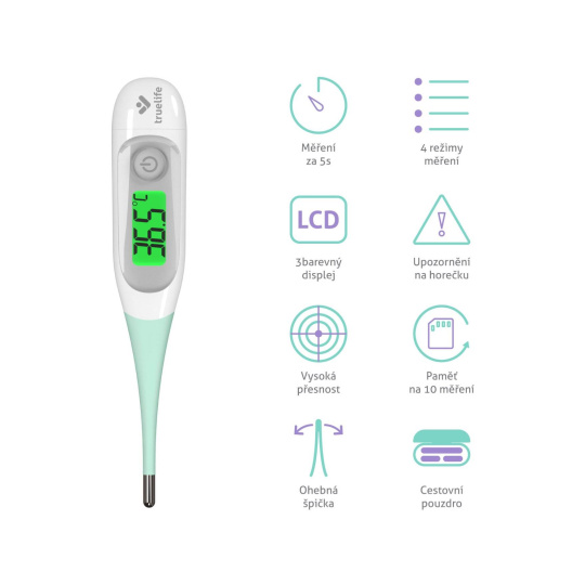 Ak patríte skôr ku vyznávačom klasiky, iste vás poteší kontaktný teplomer TrueLife Care T3. Dopĺňa portfólio bezkontaktných teplomerov TrueLife a je dôkazom, že aj klasiku je možné pojať moderne. Tento spoľahlivý digitálny teplomer s ohybnou špičkou zmeria teplotu už za 5 sekúnd, a to veľmi presne. Namerané hodnoty hneď vidíte na dobre čitateľnom displeji, ktorý mení podsvietenie podľa teploty. Teplomer šetrne zmeria teplotu na troch miestach tela, hodí sa teda pre bábätká aj dospelých, a umožňuje tiež meranie teploty vody. TrueLife Care T3 neobsahuje ortuť, sklo a žiadne škodlivé látky, bez problémov ho teda zbalíte do cestovného puzdra a môžete sa vydať kamkoľvek. Navyše batéria vydrží až 1000 meraní.