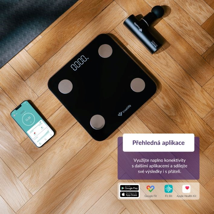 Chytrá váha TrueLife FitScale W1 BT Black meria pomocou bioelektrickej impedančnej analýzy (BIA) celkovú telesnú kompozíciu, vďaka čomu zistíte okrem hmotnosti aj ďalšie informácie ako pomer svalovej hmoty, tuku, vody. Celkovo je k dispozícii 20 merateľných indexov, ktorých vysvetlenie nájdete v aplikácii Fitdays, ktorá poskytuje kompletný a prehľadný report o stave vášho zdravia a kondície, zároveň navrhuje cesty na zlepšenie. Prepojenie váhy s aplikáciou prebieha cez Bluetooth a dáta sa potom automaticky synchronizujú.