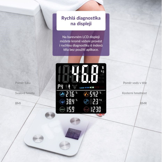 Veľký prehľadný farebný LCD displej zobrazí aktuálnu hmotnosť a 7 indexov tela.