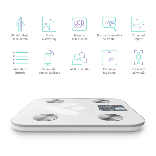 Váha dokáže automaticky rozpoznať až 8 používateľov a zapamätať si ich údaje. Navzájom si tak môžu porovnávať výsledky a sledovať svoje pokroky.
