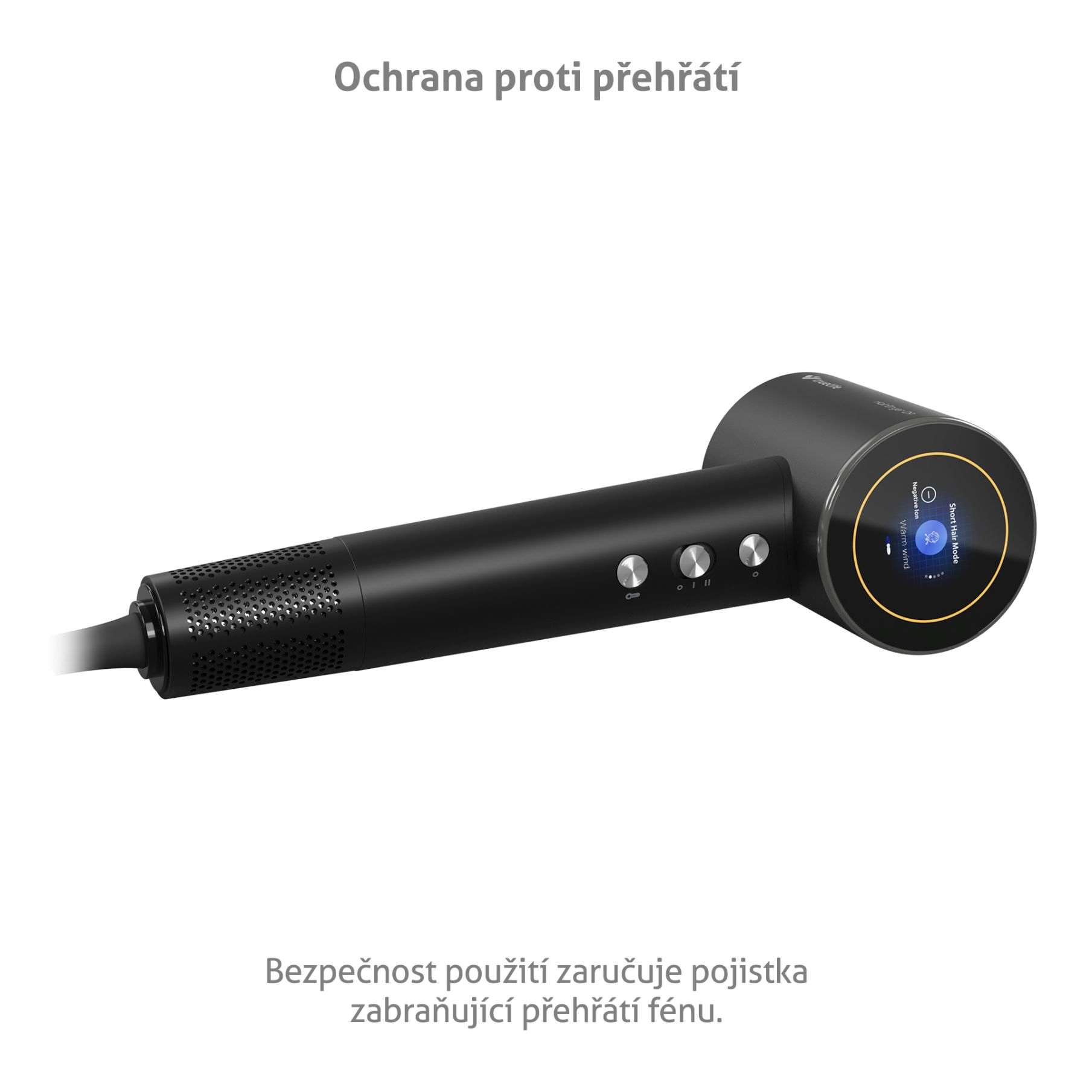 Fén je vybavený okrúhlym farebným displejom LED, ktorý prehľadne zobrazuje informácie o procese sušenia vlasov – zvolený režim, rýchlosť a ionizáciu.