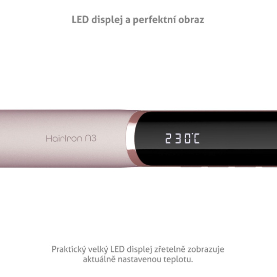 Zoznámte sa s novou kráľovnou vašej kúpeľne pre rýchly a prirodzený styling, žehličkou na vlasy TrueLife HairIron N3 s veľkým LED displejom. Vlasy narovná s maximálnou starostlivosťou a zanechá ich také hebké, že sa ich budete chcieť stále dotýkať. Na prvý pohľad zaujme svojím dizajnom so zaoblenými hranami, ktoré umožňujú aj tvorbu vlniek. Ešte viac si vás získa luxusný keramický povrch nahrievacích doštičiek, ktoré sa rýchlo zahrievajú, udržiavajú teplo rovnomerne rozložené, čím chránia vlasy pred poškodením a vysušením a dodávajú im dokonalý lesk. Dokonalý účes a vyživenejšie vlasy zabezpečí ionizátor s technológiou TrueLife UltraIonic®, vďaka ktorej sa vlhkosť z vlasov rýchlejšie odparí aj pri nižšej teplote. Žehlička ponúka až 12 možností nastavenia teploty, takže si starostlivosť môžete prispôsobiť presne na mieru svojim vlasom. K pohodlnému používaniu prispieva aj kábel otočný o celých 360° a zámok, ktorý uľahčuje skladovanie, napríklad na cestách.