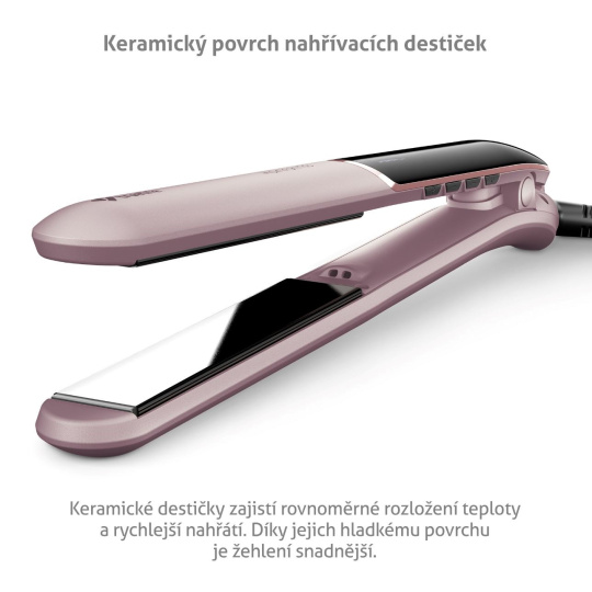 Nahrievacie doštičky žehličky sú vyrobené z keramiky, ktorá sa rýchlo zahrieva, zabezpečuje rovnomerné rozloženie tepla, jej hladký povrch uľahčuje žehlenie, chráni vlasy a dodáva im lesk.