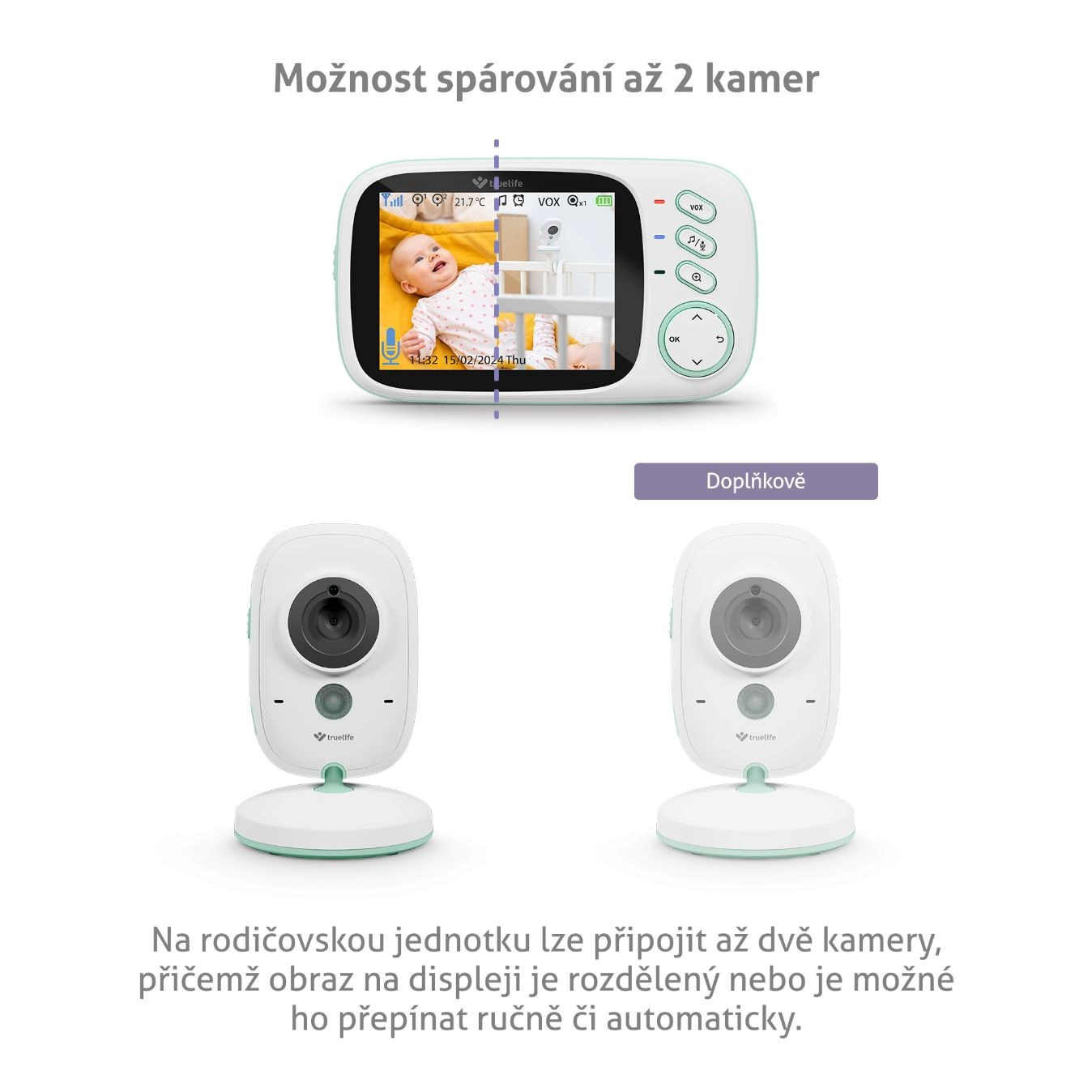 K rodičovskej jednotke možno pripojiť až dve kamery, pričom zobrazenie na displeji možno rozdeliť alebo prepínať manuálne či automaticky.