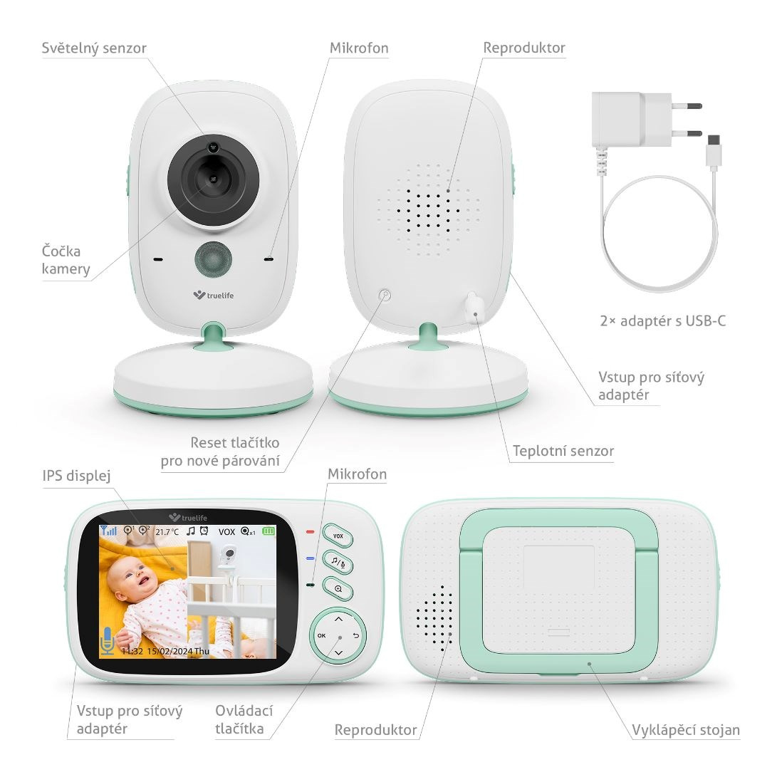 Nebojte sa, že by sa pestúnka len tak vybila, jej batéria s teraz ďaleko väčšou kapacitou 1000 mAh (u predchádzajúceho modelu bola iba 750 mAh) vydrží až 4,5 hodiny a v prípade, že aktivujete úsporný VOX režim šetriaci batériu, vydrží jej kapacita až na 20 hodín. Aj keď je úsporný režim aktivovaný, napriek tomu vám nič neunikne. Hneď ako opatrovateľka detekuje zvuk, displej rodičovskej jednotky sa okamžite rozsvieti. Zatiaľ čo rodičovskú jednotku si postavíte vďaka praktickému stojanu, na detskú jednotku si u tejto opatrovateľky môžete dokúpiť veľmi flexibilný držiak TrueLife NannyCam H32 Holder. Ten ľahko obmotáte okolo postieľky a potom si len kameru naklopíte podľa potreby. Pre dobitie opatrovateľky využijete USB-C kábel.