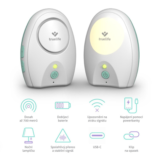 Okrem spoľahlivého signálu disponuje opatrovateľka indikáciou slabej batérie a regulátorom hlasitosti. Súčasťou detskej jednotky je praktické nočné svetielko, vďaka ktorému môžete pohodlnejšie reagovať na potreby svojho bábätka.