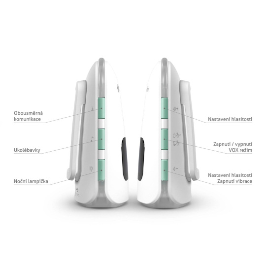 V prípade, že je aktivovaný režim VOX, sa detská jednotka aktivuje až vo chvíli, keď zaznamená nejaký zvuk. Tento režim tak zvyšuje výdrž batérie v oboch jednotkách.
