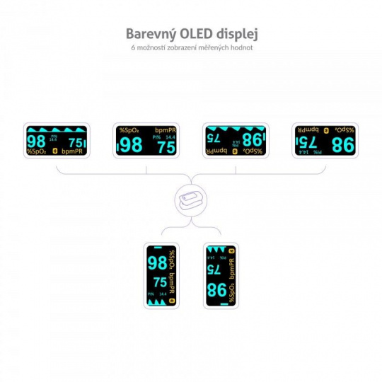Oximeter disponuje prehľadným OLED displejom, ktorého nastavenie je možné prispôsobiť podľa vašich preferencií. Na výber je 6 možností zobrazenia meraných hodnôt. Môžete si nastaviť aj preferovanú intenzitu jasu, zvukový indikátor, či zvukový doprovod tepu. Vďaka zabudovanému Bluetooth je možné oximeter spárovať so smartfónom. Namerané hodnoty máte uložené v aplikácii, ktorá je v češtine, a ich históriu tak máte neustále pri sebe a môžete ju zdieľať s lekármi alebo rodinou. Vývoj merania vidíte v aplikácii na prehľadnom grafe.