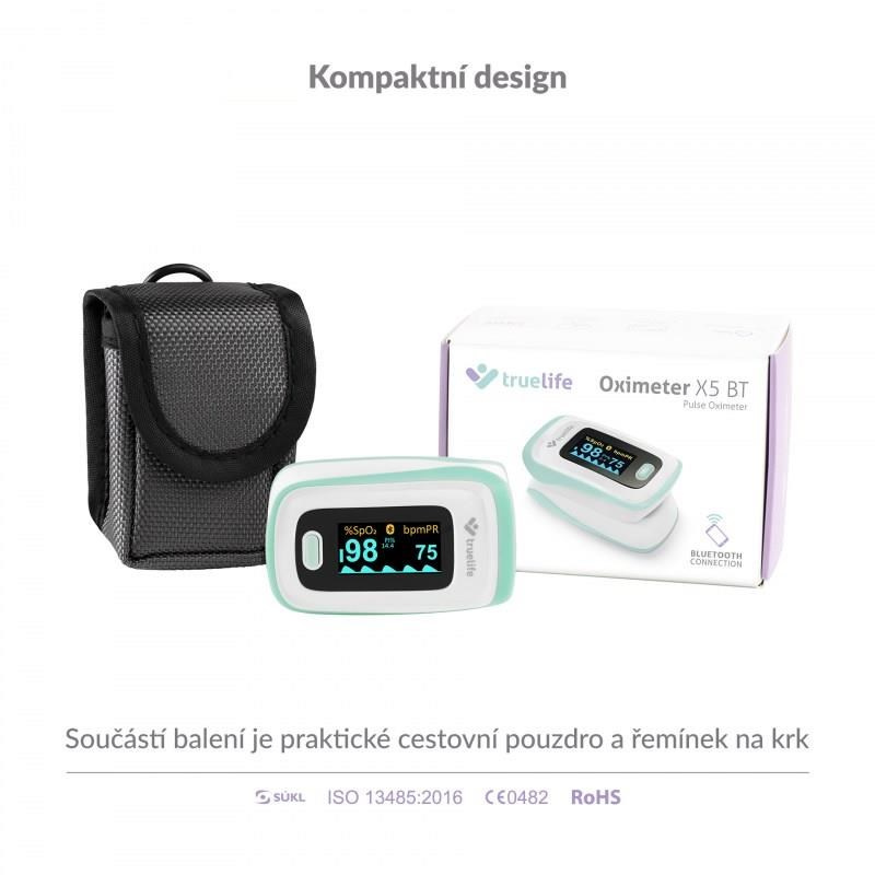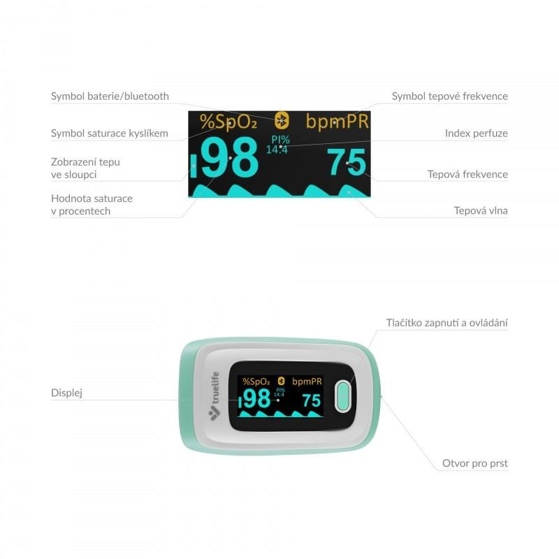 Pulzný Oximeter Truelife X5 BT je malý praktický prístroj, s ktorým ľahko, okamžite a bezbolestne zistíte saturáciu krvného hemoglobínu kyslíkom, tepovú frekvenciu a perfúzny index. Malý prístroj, ktorý jednoducho umiestnite na prst, je ideálnym pomocníkom pre osoby s respiračným ochorením, ochorením srdca, astmatikou, ale aj vrcholových športovcov. Oximeter je vybavený OLED displejom, ktorý zobrazuje namerané hodnoty. Displej ponúka nastaviteľnú intenzitu jasu a 6 režimov zobrazenia meraných hodnôt. Oximeter TrueLife X5 BT spoľahlivo zmeria váš tep aj saturáciu krvi kyslíkom v pohodlí domova, bez nutnosti návštevy lekára a bez bolesti. Vďaka zabudovanému Bluetooth je možné oximeter spárovať s telefónom a hodnoty merania uchovávať v mobilnej aplikácii.