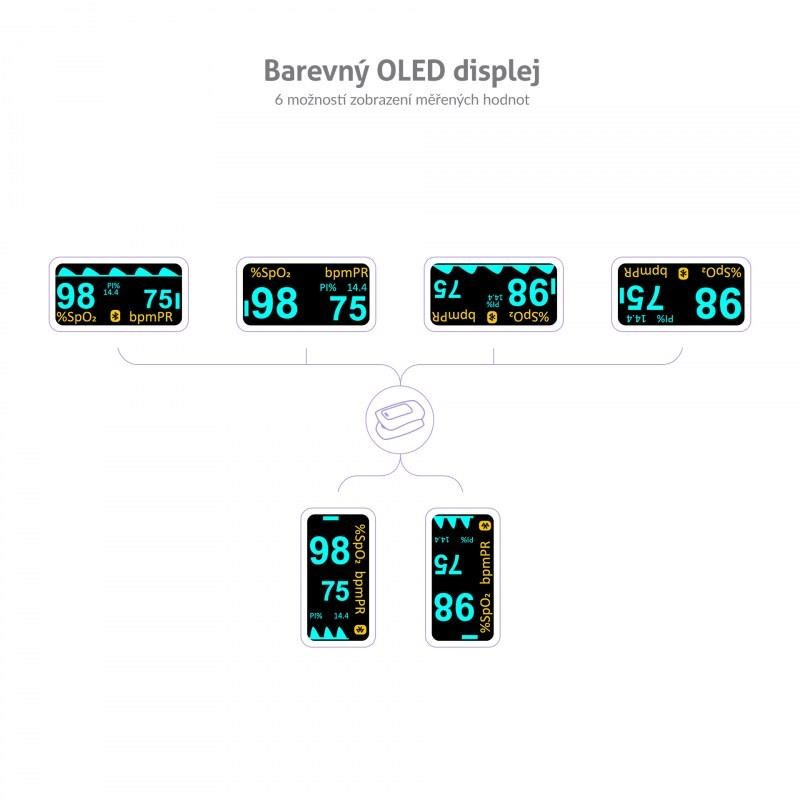 Oximeter disponuje prehľadným OLED displejom, ktorého nastavenie je možné prispôsobiť podľa vašich preferencií. Na výber je 6 možností zobrazenia meraných hodnôt. Môžete si nastaviť aj preferovanú intenzitu jasu, zvukový indikátor, či zvukový doprovod tepu. Vďaka zabudovanému Bluetooth je možné oximeter spárovať so smartfónom. Namerané hodnoty máte uložené v aplikácii, ktorá je v češtine, a ich históriu tak máte neustále pri sebe a môžete ju zdieľať s lekármi alebo rodinou. Vývoj merania vidíte v aplikácii na prehľadnom grafe.