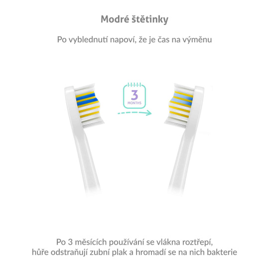 Hlavice disponujú modrými štetinkami, ktoré indikujú mieru opotrebenia. Jednoducho spoznáte, že je na čase hlavicu vymeniť.