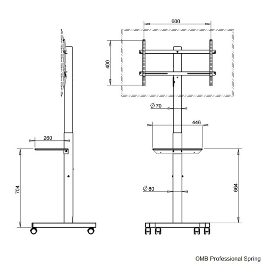 Tv stojan OMB Professional Spring Televízny stojan s plynovou pružinou pre jednoduché a rýchle nastavenie výšky 140-170cm bez náradia, nosnosť 40kg, VESA 100x100 až 600x400, na televízory a monitory 32" až 65" Profesionálny stojan robustnej, veľmi pevnej, bezpečnej a stabilnej konštrukcie, ktorý má vo vnútri nosníka integrovanú plynovú pružinu pre možnosť veľmi jednoduchého nastavenia výšky obrazovky bez nutnosti použitia akéhokoľvek náradia, navyše neuveriteľne rýchlo a pohodlne. Plynová pružina zabezpečí po stlačení bezpečnostnej páčky plynulé vysunutie obrazovky do hornej polohy, v prípade potreby znížiť výšku stačí zatlačiť na obrazovku. Regulovať výšku je možné v rozmedzí 140cm až 170cm (výška stojana po stred obrazovky). Stojan je ideálny na televízory a monitory s hmotnosťou do 40kg, ktoré podporujú akýkoľvek VESA štandard v rozmedzí 100x100 až 600x400mm vrátane. Odporúčaná uhlopriečka je 32" až 65", avšak je možné použiť aj väčšie obrazovky až do uhlopriečky 65". Podstavec stojana je osadený kvalitnými pojezdovými kolieskami, ktoré zabezpečujú vynikajúcu mobilitu. Televízny stojan OMB Professional Spring dodávame v čiernom prevedení. Televízny stojan s nastavením výšky a kolieskami OMB Professional Spring Technické údaje: max. zaťaženie 40kg podpora VESA štandardu 100x100 až 600x400 odporúčaná uhlopriečka zavešené obrazovky 32" až 65" nastaviteľná výška stojana v rozmedzí 1400 až 1700mm integrovaná plynová pružina pre jednoduché a rýchle nastavenie výšky bez použitia náradia možnosť dokúpenia police na príslušenstvo OMB Shelf Handy s rozmermi 447x300mm nosnosť police na príslušenstvo 5kg robustná, veľmi pevná konštrukcia profesionálna kvalita bezpečný, stabilný stojan farebné prevedenie čierne záruka 3 roky Televízny stojan s plynovou pružinou pre jednoduché a rýchle nastavenie výšky v rozmedzí 140 až 170cm, nosnosť 40kg, VESA štandard 100x100 až 600x400 - OMB Professional Spring Televízny stojan OMB Professional Spring podporuje VESA štandardy: VESA 100x100 VESA 200x100 VESA 200x200 VESA 300x200 VESA 300x300 VESA 400x200 VESA 400x300 VESA 400x400 VESA 600x400 Na TV stojan je možné zavitieť všetky typy televízorov a monitorov, ktoré majú hmotnosť do 40kg a podporujú ktorýkoľvek z vyššie uvedených VESA štandardov. Veľkosť televízora nie je podstatná, len odporúčame minimálnu uhlopriečku 32", ideálne 37" a väčšie. Na televízny stojan OMB Professional Spring je možné dokúpiť police na príslušenstvo OMB Shelf Handy s nosnosťou 5kg: Police na príslušenstvo ku stojanu OMB Professional Spring - OMB Shelf Spring Vďaka výbornému riešeniu nastaviteľnej výšky pomocou plynové pružiny zvládne nastavovanie výšky bez akéhokoľvek náradia a námahy ktokoľvek. Stojan je ideálny na využitie pri prezentáciách, výstavách, prednáškach, konferenciách, čakárňach a kdekoľvek pre komerčné aj nekomerčné účely.