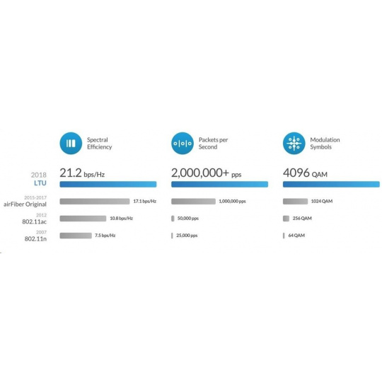 aF-5XHD je v súčasnosti najvýkonnejšie a najlepšie vybavené zariadenie airFiber od spoločnosti Ubiquiti Networks. Revolučný integrovaný obvod airFiber LTU dokáže spracovať viac ako 2 milióny paketov za sekundu pri reálnej rýchlosti prenosu dát 1 Gb/s+ (TDD) v bezlicenčnom pásme 5 GHz pri 1024QAM (plánovaný firmvér by mal podporovať až 4096QAM s ešte vyššou priepustnosťou). Medzi ďalšie kľúčové funkcie patrí 2x Gigabit LAN, pričom jeden port je určený len na správu, synchronizácia času prostredníctvom GPS, špecializovaný spektrálny analyzátor, vysoká odolnosť voči vode (IP67) a nastaviteľná šírka kanálov 10/20/30/40/50/60/80 a 100 MHz. AirFiber 5XHD je vodotesný a ideálny do všetkých poveternostných podmienok vďaka veľmi dobrej konštrukcii a priloženému gumovému adaptéru.