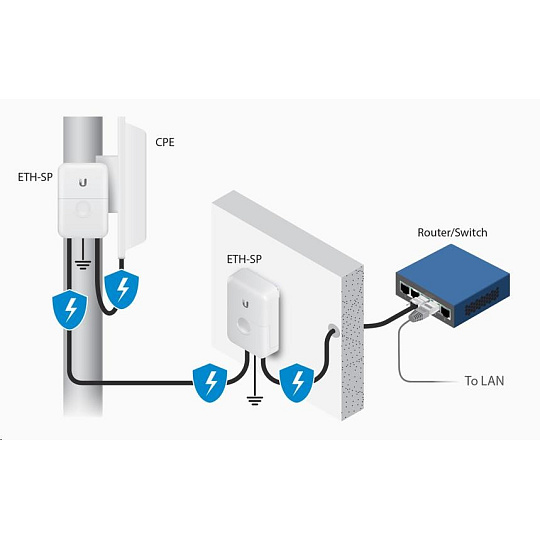 hoci všetky jednotky UBNT majú integrovanú ochranu proti ESD, ETH-SP možno použiť ako dodatočnú vrstvu ochrany, čo sa veľmi odporúča. Možnosť poškodenia v dôsledku ESD je tak výrazne eliminovaná.