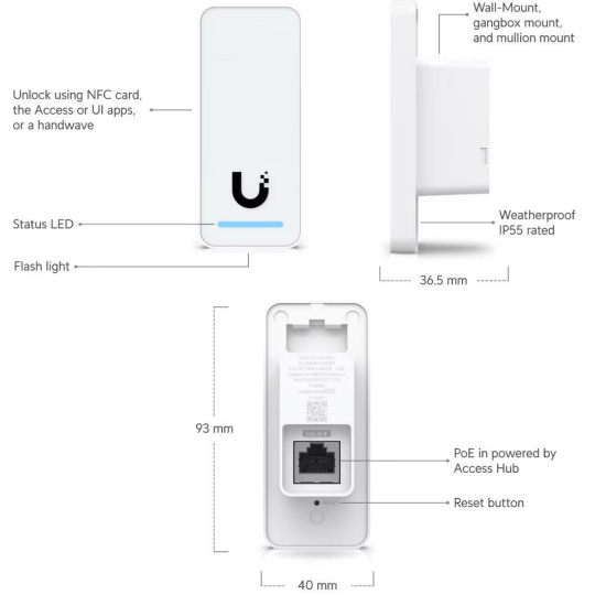 Popis produktu UniFi Access Reader G2 je čtečka NFC, která je součástí řešení UniFi Access. Čtečka pro komunikuje s ostatními prvky používá LAN port s podporou 802.3af PoE, snadno se instaluje pod omítku, má stupeň krytí IP55 a podporuje nejnovější bezpečnostní standardy NFC (13.56 MHz) včetně šifrování MIFARE DESFire šifrovaného pomocí AES-128. Odemknutí dveří je rychlé a bezpečné pomocí karty NFC nebo mobilní aplikace. Podporované technologie čtení • NFC Tag 1, 2, 3, 4, 5 • MIFARE Classic • MIFARE Plus • MIFARE Ultralight • MIFARE DESFire Důležité vlatnosti • Elegantní NFC a Bluetooth přístupová čtečka • Napájení pomocí 802.3af PoE pomocí UniFi Access Hubu • Pokročilé NFC zabezpečení (MIFARE DESFire) • Mobilní přístup s aplikací (1.5.9+) Obsah balení • Zařízení (UA-G2) • Montážní krabička do zdi • Šroubky Technické parametry Konektory a rozhraní Technologie čtení:Mifare (13.56 MHz) Rychlost LAN:(1) 10/100Mbps Napájení Napájení přes PoE:802.3af Typ napájení:PoE Max. spotřeba energie [W]:5 Fyzické charakteristiky Stupeň krytí:IP55 Tlačítka:Reset Provozní teplota [°C]:-30 až 45 Hmotnost [g]:82 Šířka [mm]:40 Výška [mm]:93 Hloubka [mm]:37.