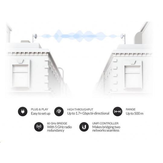 UniFi Building Bridge je 60GHz prepojenie bod-bod so záložným 5GHz pripojením na rozšírenie siete do susednej budovy. Priepustnosť spojenia je 1.7 Gb/s+ s maximálnym dosahom 500 m a správou alebo monitorovaním cez UniFi Controller.