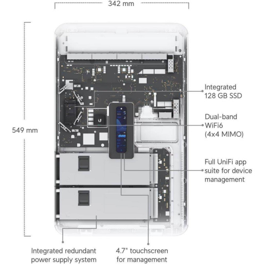 Popis produktu Dream Wall je další z řady zařízení UniFi All-in-one. Ukrývá v sobě bránu s firewallem, Wi-Fi 6 access point, NVR a switch s funkcí PoE. Jednotka poskytuje široké možnosti připojení do sítě. Nabízí možnost připojení 10Gbps SFP+ portem nebo ethernetovým portem 2.5Gbps. Pro připojení dalších zařízení v síti LAN pak nabízí 10Gbps SFP+ port spolu se 17 ethernetovými 1Gbps porty, z nichž 12 disponuje funkcí PoE (4x POE++, 4x POE+ a 4x POE). Z výroby je zařízení osazeno jedním hot-swap zdrojem s výkonem 550W a k dispozici je druhá pozice pro redundanci. Maximální spotřeba zařízení činí 532W včetně připojených napájených zařízení. Radiová část podporuje nejnovější standard WiFi 6 (802.11ax), je zpětně kompatibilní se staršími standardy a disponuje technologií MIMO 2x2 (2.4 Ghz) a 4x4 (5 GHz) s maximální modulační rychlostí 300 + 2400 Mbps. Ke všem důležitým informacím o zařízení a síti se dostanete ihned díky integrovanému displeji s úhlopříčkou 4,7". Pro ukládání kamerových záznamů slouží předinstalovaná 512GB microSD karta a zařízení disponuje také vlastním SSD diskem s kapacitou 128GB. Podporované UniFi služby • UniFi Network Controller • UniFi Protect • UniFi Access • UniFi Talk • UniFi Connect Výhody UniFi řešení • Zero Handoff Roaming - bezvýpadkový přechod mezi jednotlivými AP • Wireless uplink (hodí se tam, kam není možné dostat datový kabel) • Až 4 SSID • Detailní statistiky provozu • Guest síť • Load balance - udržování rovnoměné zátěže / přepínání klientů • Omezování rychlosti pro každé SSID Technické parametry Bezdrátové vlastnosti Bezdrátové frekvence:2.4 + 5 GHz (dual band) WiFi standardy:802.11n, 802.11a, 802.11ac, 802.11b/g, 802.11ax Přenosová rychlost - 5GHz [Mb/s]:2402 Přenosová rychlost - 2.4GHz [Mb/s]:300 Vysílací výkon 2.4GHz [dBm]:23 Vysílací výkon 5GHz [dBm]:26 Šifrování:WEP, WPA, WPA2, WPA3 2.4GHz MIMO:2 x 2 5GHz MIMO:4 x 4 Typ antény:Vestavěná Roaming:Ano Zisk antény [dBi]:6 Konektory a rozhraní Rychlosti WAN:(1) 100/1000/2500Mbps Slot na paměťové karty:microSD - až 512GB Rychlost LAN:(17) 10/100/1000Mbps Gigabit LAN:Ano Optické rozhraní:(2) 10Gbps Ostatní:Dotykový displej, Bluetooth Napájení Typ napájení:Ze sítě (230V) Typy PoE:PoE-Out (pouze) Podporované PoE-Out standardy:802.3af, 802.3at, 802.3at - ultra PoE (60W) Redundantní napájení:Ano Počet PoE Out portů:12 PoE budget [W]:422 Max. spotřeba energie [W]:532 Napájení přes konektor/svorkovnici:230V AC Fyzické charakteristiky Provedení:Na zeď Použití:Vnitřní Tlačítka:Reset Provozní teplota [°C]:-10 až 40 Hmotnost [g]:8600 Šířka [mm]:342 Výška [mm]:549 Hloubka [mm]:62 Hardware CPU:ARM Cortex-A57 Frekvence CPU [MHz]:1700 Počet CPU jader:4 RAM [MB]:4096 Software Předinstalovaný kontroller:UniFi Protect, UniFi controller Operační mód:AP Router Management:UniFi controller Výchozí IP adresa:192.168.1.1 Výchozí jméno a heslo:Nastavuje se při prvním spuštění.