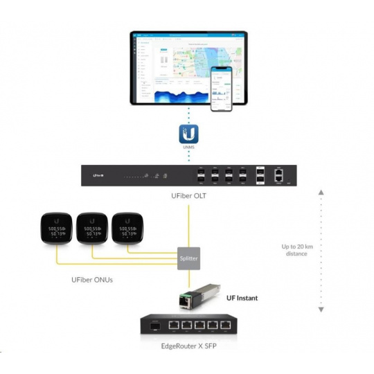 uF-Instant je modul GPON SFP s jedným konektorom SC a je určený na použitie so zariadeniami Ubiquiti EdgeSwitch, EdgeRouter, UniFi Switch a USG alebo s produktmi UF-AE a F-POE-G2. Modul je určený pre trasy dlhé až 20 km a dokáže komunikovať s jednotkou OLT asymetrickou rýchlosťou 2.4 Gb/s preberanie a 1.nahrávanie 2 Gb/s.
