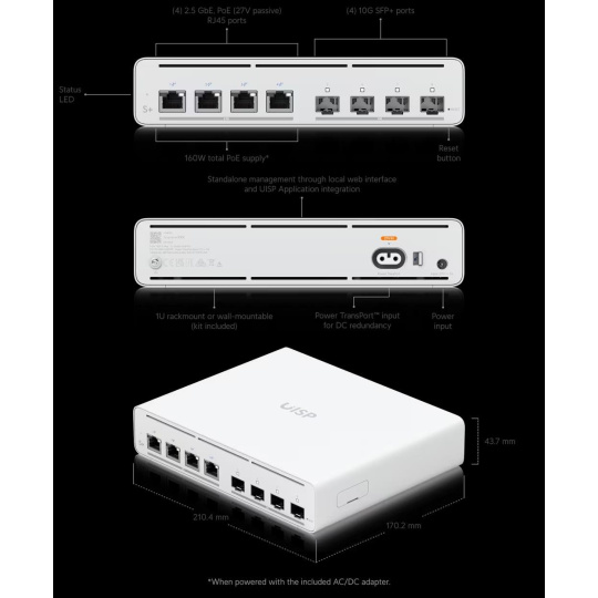 2.5 GbE PoE switch for ISP applications. (4) 2.5 GbE RJ45 ports with 27V passive PoE output (4) 10G SFP+ ports 160W (27V) total PoE availability*, 20W/port (2-pair) / 40W/port (4-pair) Port isolation, speed limiting, and DHCP snooping functionality (1) Power TransPort™ input for DC redundancy Desk, wall, 1U rack, and outdoor** mounting Standalone management through local web interface and UISP Application integration *When powered with the included AC/DC adapter. **When enclosed in the UISP Box Plus (sold separately)..