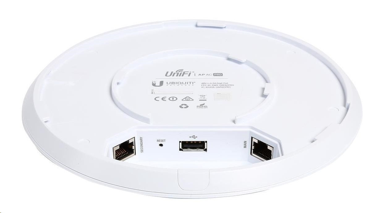 uAP-AC-PRO je navrhnutý na vnútorné aj vonkajšie použitie a ponúka rýchlosť 450 Mb/s v 2.4GHz (3x3MIMO) + 1300Mbps v 5GHz(3x3MIMO). Napájanie je realizované aktívnym PoE podľa 802.3af/at. K dispozícii sú dva gigabitové ethernetové porty. Technické údaje: