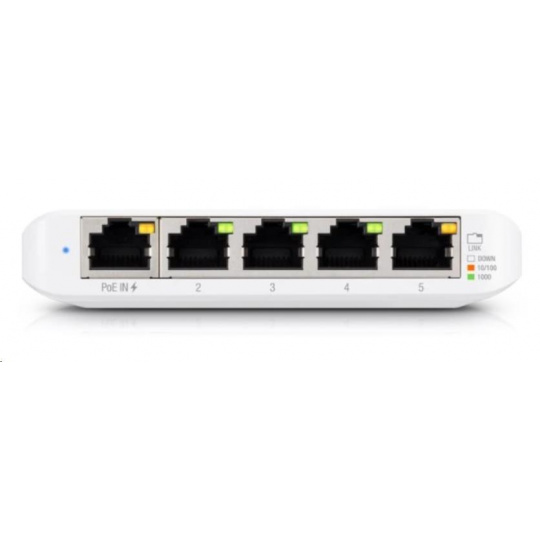 USW-Flex-Mini je malý 5-portový gigabitový prepínač so správou UniFi Controller od spoločnosti Ubiquiti Networks v stolnom vyhotovení s prvým portom podporujúcim PoE In.