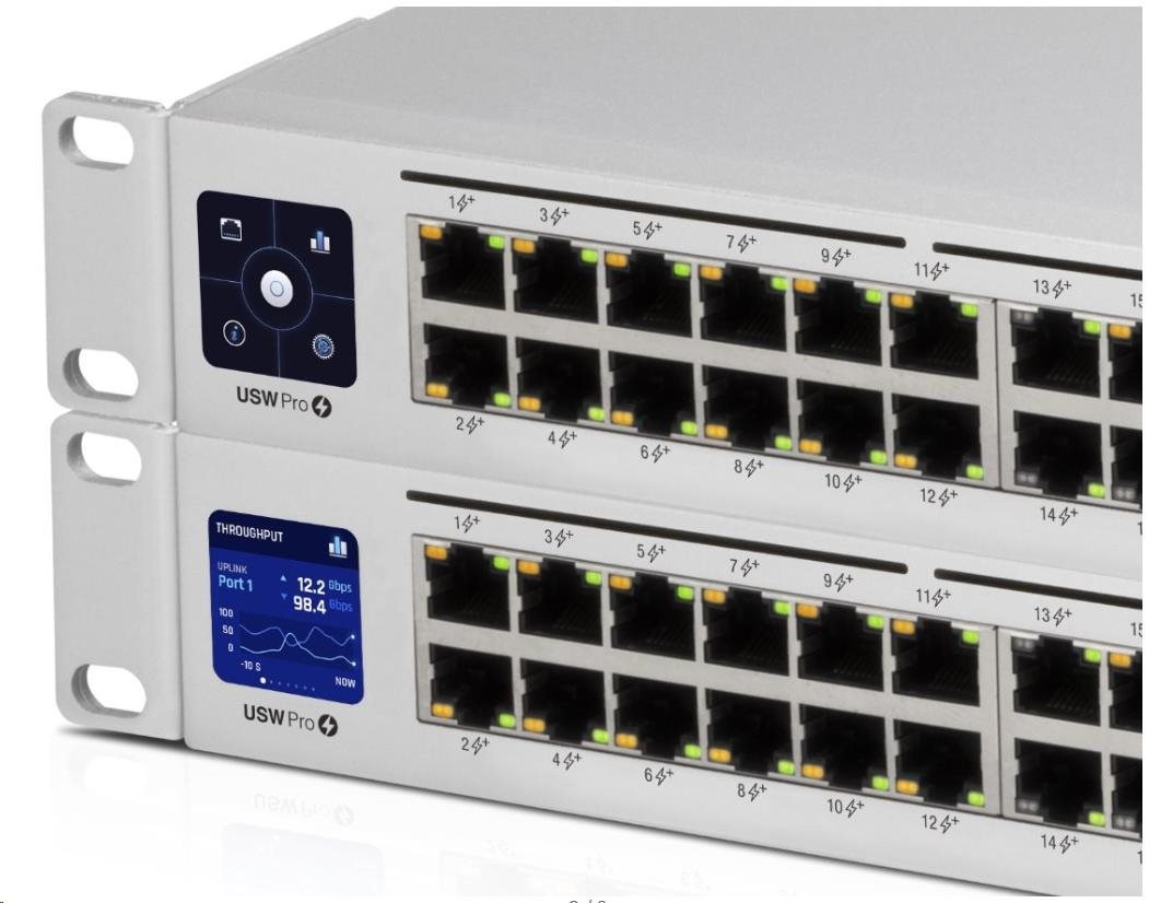USW-Pro-48-POE Gen2 má celkovo 48 portov s funkciou POE-Out. Porty 1-40 podporujú štandard 802.3af/at, porty 41-48 potom 802.3bt (60W). Celkový rozpočet POE je 600 W (celkový výkon zdroja 460 W, 60 W vlastnej spotreby prepínača).