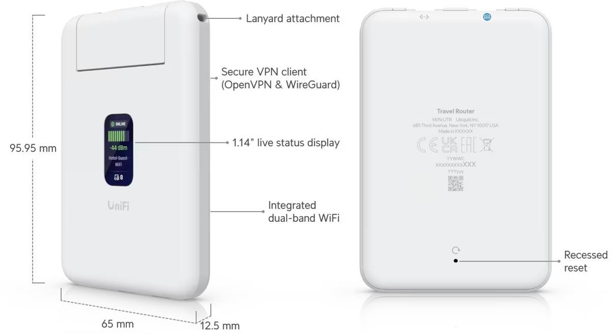 Popis produktu Ubiquiti UniFi Travel Router je ultra-kompaktní cestovní dual-band Wi-Fi 5 router pracující současně v pásmech 2,4GHz a 5GHz pro dosažení maximální propustnosti až 1,17Gbps, který je dále vybaven (2) 1Gbit porty a intuitivním displejem. Router může sdílet mobilní data z telefonu nebo proměnit veřejnou Wi-Fi síť na soukromou. Díky funkci Teleport lze snadno vytvořit zabezpečený VPN tunel zpět do vaší UniFi sítě odkudkoliv. Klíčové vlastnosti • (2) 1Gbit porty (1x LAN, 1x LAN/WAN) a dual-band Wi-Fi 5 • Celková propustnost až 1,17Gbps - 300Mbps na 2,4GHz (2x2) a 867Mbps na 5GHz (2x2) • USB tethering - sdílení mobilních dat z telefonu přes USB-C • Teleport - WireGuard VPN připojení k UniFi gateway bez potřeby konfigurace • Napájení přes dedikovaný USB-C port • Bezdráty • WiFi Routery • WiFi 5 Ubiquiti UTR, Cestovní Dual-Band Wi-Fi 5 router +6 dalších Novinka Vaše cena bez DPH 1 430 Kč 1 545 Kč Recyklační poplatek 1.70 Kč Vaše cena s RP 1 432 Kč Vaše cena s DPH (21%) 1 733 Kč Očekáváme 10.3.2026 PlzeňOčekáváme 10.3.2026 Dostupnost na našich pobočkách Přidat do košíku Výrobce Ubiquiti Kód 10904731 Part No. UTR Záruka 24 měsíců Stránky výrobce PorovnatDotaz na produktDo oblíbenýchHlídatNavrhnout úpravu • Související produkty3 MikroTik MT13-052400-E15BG, napájecí adaptér 5V 2.4A, 12W, pro hAP ax lite MT13-052400-E15BG 107 Kč bez DPH Skladem 23 ks Masterlan patch kabel UTP, Cat5e, 1m, žlutý PCU5E-1YW-MS 8 Kč bez DPH Skladem > 99 ks Masterlan comfort patch kabel UTP, Cat5e, 5m, šedý PCU5E-5-MSC 46 Kč bez DPH Skladem 85 ks Ke stažení GPSR Popis produktu Ubiquiti UniFi Travel Router je ultra-kompaktní cestovní dual-band Wi-Fi 5 router pracující současně v pásmech 2,4GHz a 5GHz pro dosažení maximální propustnosti až 1,17Gbps, který je dále vybaven (2) 1Gbit porty a intuitivním displejem. Router může sdílet mobilní data z telefonu nebo proměnit veřejnou Wi-Fi síť na soukromou. Díky funkci Teleport lze snadno vytvořit zabezpečený VPN tunel zpět do vaší UniFi sítě odkudkoliv. Klíčové vlastnosti • (2) 1Gbit porty (1x LAN, 1x LAN/WAN) a dual-band Wi-Fi 5 • Celková propustnost až 1,17Gbps - 300Mbps na 2,4GHz (2x2) a 867Mbps na 5GHz (2x2) • USB tethering - sdílení mobilních dat z telefonu přes USB-C • Teleport - WireGuard VPN připojení k UniFi gateway bez potřeby konfigurace • Napájení přes dedikovaný USB-C port Zařízení je spravováno lokálně pomocí webového rozhraní a výrobce nabízí také vzdálenou správu pomocí portálu UniFi Mobility Manager, která je ale výrobcem zpoplatněna. Obsah balení • Zařízení • USB-C - USB-C kabel Technické parametry Bezdrátové vlastnosti Bezdrátové frekvence:2.4 + 5 GHz (dual band), Bluetooth WiFi standardy:802.11n, 802.11a, 802.11ac, 802.11b/g Přenosová rychlost - 5GHz [Mb/s]:866 Přenosová rychlost - 2.4GHz [Mb/s]:300 Vysílací výkon 2.4GHz [dBm]:13 Vysílací výkon 5GHz [dBm]:13 2.4GHz MIMO:2 x 2 5GHz MIMO:2 x 2 Typ antény:Vestavěná Počet vestavěných antén:2 Konektory a rozhraní Počet portů USB-C:2 Rychlost LAN:(1) 10/100/1000Mbps + (1) 10/100/1000Mbps LAN/WAN Gigabit LAN:Ano USB:Ano Ostatní:LCD displej, Bluetooth Napájení Typ napájení:USB-C Max. spotřeba energie [W]:5 Fyzické charakteristiky Použití:Vnitřní Tlačítka:Reset Provozní teplota [°C]:-10 až 40 Hmotnost [g]:89 Šířka [mm]:65 Výška [mm]:96 Hloubka [mm]:13 Software Podporované VPN:OpenVPN, WireGuard Operační mód:AP Router.