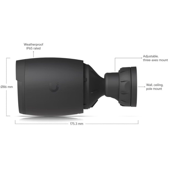 Popis produktu Bullet kamera AI Professional od Ubiquiti Networks je kamera s 8MP rozlišením (3840 x 2160px při 30 fps), opravdu velkým 1/1.8" senzorem, varifokálním objektivem 4.1 až 12.3mm, motorickým 3x optickým zoomem, pozorovacím úhlem 35 až 110°, integrovanými vysokovýkonnými infračervenými LED diodami pro noční vidění, mikrofonem, reproduktorem, stupněm krytí IP65 proti vodě a antivandal ochraně IK04. Kamera ke komunikaci směrem do sítě využívá Gigabitový LAN port s podporou napájení přes 802.3af PoE s maximální spotřebou 11W. UniFi Protect Software UniFi Protect Controller je výkonná integrovaná IP video monitorovací platforma určená pro práci s kamerami UniFi Protect a mobilní aplikací UniFi Protect. Klíčové vlastnosti • 4K rozlišení - 8MP, 3840 x 2160px při 30 fps • 3x optický zoom • IR přísvit s automatickým IR cut filtrem • Pokročilá AI detekce: detekce lidí, čtění SPZ a další • Integrovaný audio mikrofon a reproduktor • IP65 krytí + antivandal IK04 Obsah balení • Zařízení • Držák na zeď • Příchytový materiál Technické parametry Kamera Typ objektivu:Varifokální - motorický Objektiv [mm]:4,1 až 12,3 (nastavitelný) Přísvit:IR Pozorovací úhel [°]:35 až 110 Režim den/noc:IR cut filtr Obrazový senzor ["]:1/1.8 Obraz Rozlišení:8MP Technologie a vymoženosti:Čtení SPZ Max. rozlišení [pixely]:3840 x 2160 (4K UHD) Konektory a rozhraní Audio:Mikrofon, Reproduktor Rychlost LAN:(1) 10/100/1000Mbps Napájení Napájení přes PoE:37 .. 57V DC Typ napájení:PoE Max. spotřeba energie [W]:11 Fyzické charakteristiky Stupeň krytí:IP65 Použití:Venkovní Antivandal (ochrana proti nárazu):IK4 Provozní teplota [°C]:-20 až 50 Hmotnost [g]:820 Šířka [mm]:86 Výška [mm]:86 Hloubka [mm]:175 Barva:Černá Kompresní standardy Video komprese:H.264 Obecné Kamerová řada:UniFi Protect Software Výchozí IP adresa:Dynamická z DHCP.