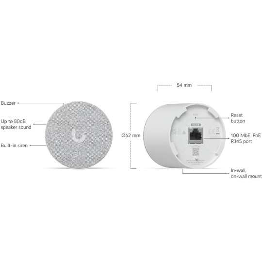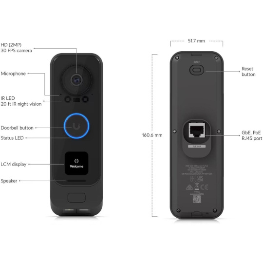 Popis produktu UVC-G4 Doorbell Pro PoE Kit je sada vnitřního zvonku a venkovního tlačítkového videozvonku s přenosem dat pouze po ethernetu. Venkovní jednotka je vybavena přední primární 5MP kamerou a spodní sekundární 8MP kamerou na zobrazení toho, co se nachází na rohožce přede dveřmi. Hlavní kamera domovního zvonku je vybavena IR LED pro poskytování lepšího nočního vidění, které v kombinaci se spodním osvětlením zajišťuje spolehlivě jasné sledování po celý den. Zvonek je také vybaven funkcí potlačení ozvěny a obousměrným audiem pro komunikaci s návštěvníky. Navíc má programovatelný displej, který umožňuje dávat upozornění nebo pokyny k doručení kurýrům. Sada je navržená jako výkonný plug-and-play bezpečnostní nástroj a lze jej nastavit a nakonfigurovat během několika minut pomocí aplikace UniFi Protect. Klíčové vlastnosti Obě kamery mají stream 1080p HD při 30 fps Gigabit LAN s 802.3af PoE (1) 5MP hlavní kamera s IR osvětlením [1600x1200 (2MP), 30 fps] (1) 8MP spodní kamera bez IR [1600x1200 (2MP), 2 fps] Obousměrné audio s potlačením ozvěny Vestavěné verandové světlo, které osvětlí objekty až do vzdálenosti 2 metrů Senzor pohybu Stupeň krytí IPX4, kryt odolný proti povětrnostním vlivům Programovatelný displej Snadné nastavení pomocí aplikace UniFi Protect Obsah balení Zařízení (venkovní jednotka) Zařízení (vnitřní jednotka) (5) Montážní držák Příchytový materiál Technické parametry Kamera Přísvit:IR Dosah přísvitu [m]:2 Pozorovací úhel [°]:138 Obraz Rozlišení:5MP Max. rozlišení [pixely]:1600 x 1200 (UXGA) Konektory a rozhraní Audio:Mikrofon, Reproduktor Ostatní:LCD displej Napájení Napájení přes PoE:802.3af, 37 .. 57V DC Typ napájení:PoE Max. spotřeba energie [W]:7 Fyzické charakteristiky Stupeň krytí:IPX4 Provozní teplota [°C]:-30 až 40 Hmotnost [g]:264 Šířka [mm]:52 Výška [mm]:161 Hloubka [mm]:35.