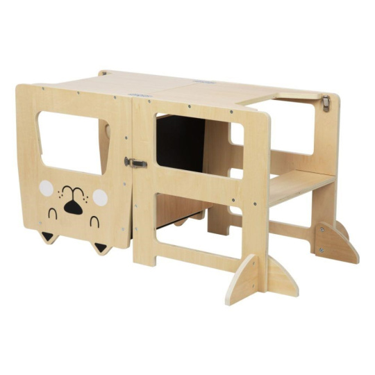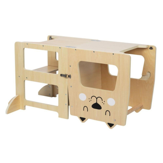 Viacúčelová učiaaca veža 4v1 je nepostrádateľným pomocníkom v domácnosti s malými deťmi. Učiaca veža Lev predstavuje detský nábytok aj hračku v jednom a poteší dievčatá aj chlapcov. Môže byť bežnou učiaacou vežou v podobe roztomilého zvieratka, môže predstavovať schody, originálny set detského nábytku (detský stolík so stoličkou) a zároveň je aj kresliaca tabuľa, na ktorú si deti môžu maľovať kriedami.