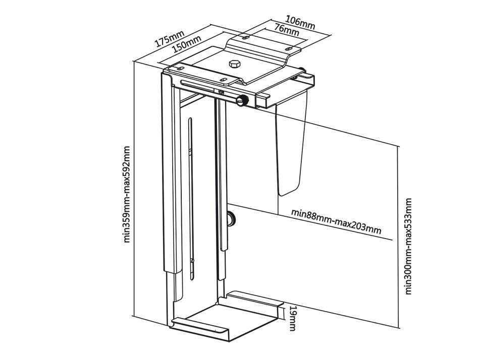 Univerzálny držiak na PC Fiber Mounts M7C13S Profesionálny držiak na PC, uchytenie na stôl alebo stenu, nastavenie na požadované rozmery, nosnosť 10kg Držiak na PC špičkovej kvality a bezpečnosti. Veľmi pevné uchytenie vášho PC na stôl alebo stenu. Nastavenie na rozmery vášho PC. Materiál oceľ, farebné prevedenie strieborné. Na PC s hmotnosťou až 10kg. Jednoduchá a rýchla inštalácia. Záruka 5 rokov. Držiak na PC / počítač pre uchytenie pod stolom, na bok stola alebo na stenu, prípadne na strop Fiber Mounts M7C13S Technické údaje: