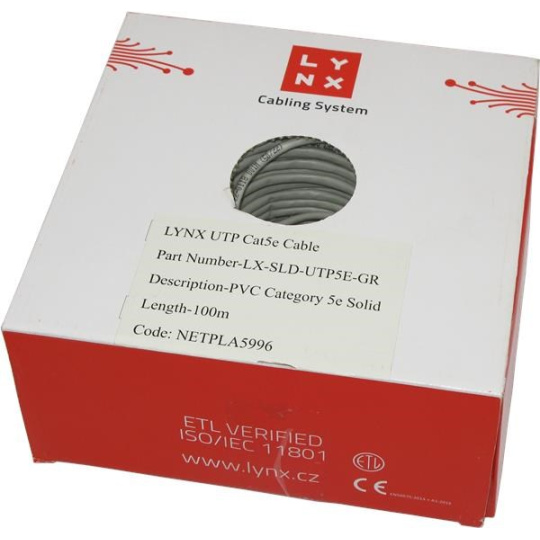 UTP kabel LYNX, Cat5E, drát, PVC, Dca, šedý, 100m