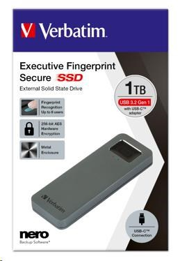 VERBATIM Externý SSD disk 1 TB, Executive Fingerprint Secure SSD, USB 3.2 Gen 1/USB-C, (W:356 MB/s, R:344 MB/s), sivá