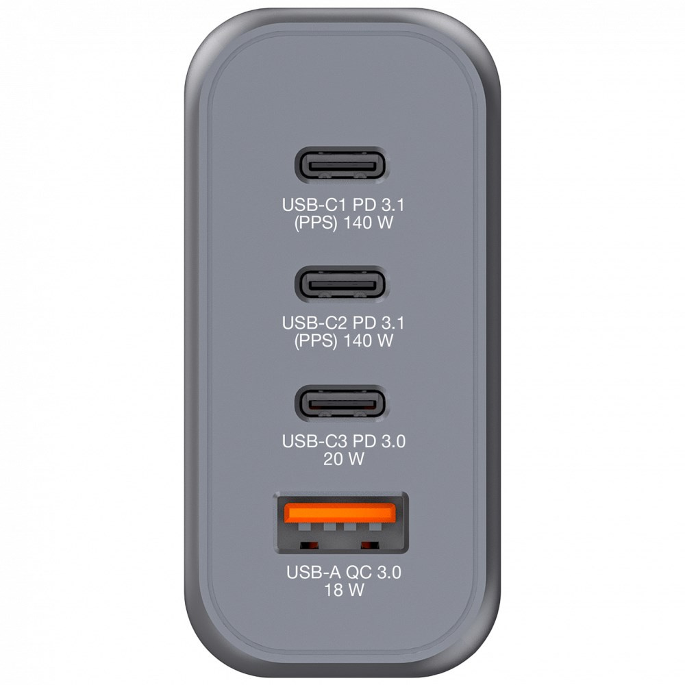 Verbatim GaN nabíjačka do siete s výkonom 140 W v dizajne, ktorý sa vmestí do dlane, kombinuje dva porty USB-C PD 140 W, jeden port USB-C PD 20 W a jeden port USB-A QC 3.0. Ideálne do kancelárie, na domáce použitie alebo na cesty, kde dodá energiu vášmu notebooku, tabletu, chytrému telefónu, herným a mnohým ďalším zariadeniam.