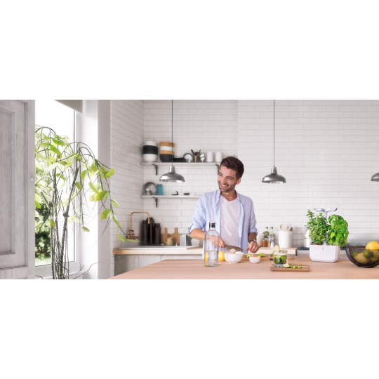 Záhradka Exky Classic sa postará o vaše rastliny automaticky, čo znamená, že dostanú správne množstvo vody a svetla bez vášho zásahu. Integrovaná nádrž na vodu poskytuje až štyri týždne autonómneho zavlažovania, čo je ideálne pre zaneprázdnené jednotlivcov alebo častých cestovateľov. Môžete si užívať čerstvé bylinky, zeleninu a kvety s minimálnym úsilím, zatiaľ čo záhradka pracuje za vás. Spotreba energie záhrádky je veľmi nízka, príkon LED je len 10 W. Vzhľadom na to, že zavlažovanie nie je riešené pumpou, záhradka nevydáva žiadny hluk.