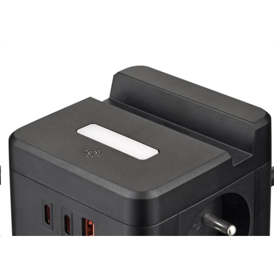 .Viking síťový adaptér YC23H, 2x 230 V, 1x USB-A, 2x USB-C, dotykové světlo, funkce stojánku, černá