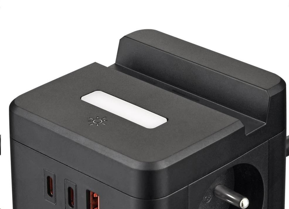 .Viking síťový adaptér YC23H, 2x 230 V, 1x USB-A, 2x USB-C, dotykové světlo, funkce stojánku, černá