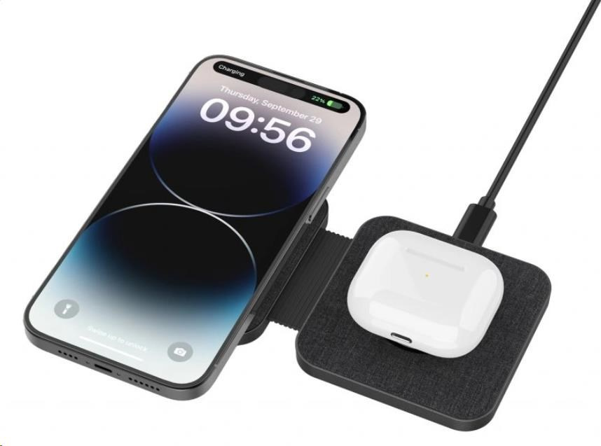 Nabíjačka ponúka dva bezdrôtové výstupy, ktoré umožňujú nabíjanie dvoch zariadení súčasne, čo je ideálne pre mobilné telefóny, hodinky a slúchadlá. Výstupný výkon pre mobilné zariadenia dosahuje až 15W, zatiaľ čo pre hodinky a slúchadlá poskytuje výkon až 2,5W. Súčasťou balenia je tiež USB-C kábel dlhý 1 m, ktorý zabezpečuje kompletné vybavenie pre rýchle a efektívne nabíjanie.