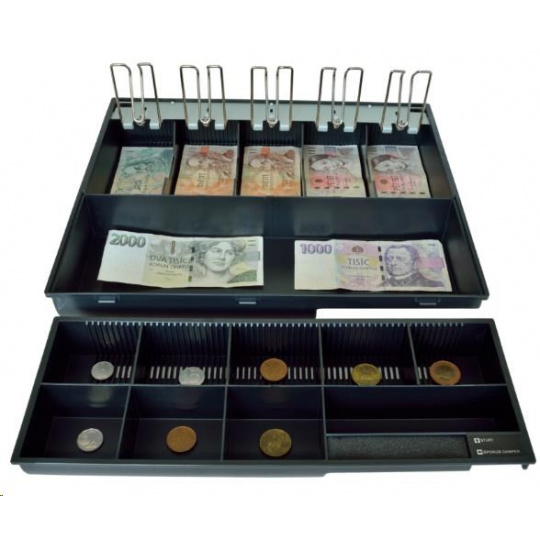 Dostatečně široký pořadač pro pohodlné umístění 5 druhů bankovek vedle sebe. Obsahuje vyjímatelný mincovník a pořadač bankovek s libovolně nastavitelnými přihrádkami. Pořadač disponuje kovovými držáky bankovek a je možné jej doplnit o uzamykatelný kryt