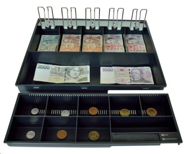 Dostatečně široký pořadač pro pohodlné umístění 5 druhů bankovek vedle sebe. Obsahuje vyjímatelný mincovník a pořadač bankovek s libovolně nastavitelnými přihrádkami. Pořadač disponuje kovovými držáky bankovek a je možné jej doplnit o uzamykatelný kryt
