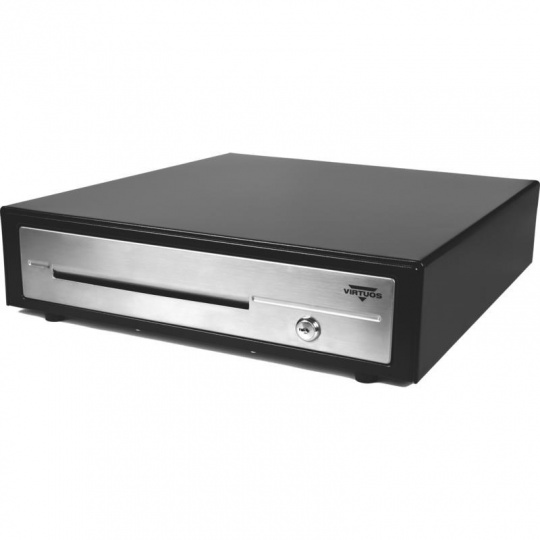 Pokladničná zásuvka Virtuos C430D - s káblom, kovové držiaky, nerezový panel, 9-24V, čierna